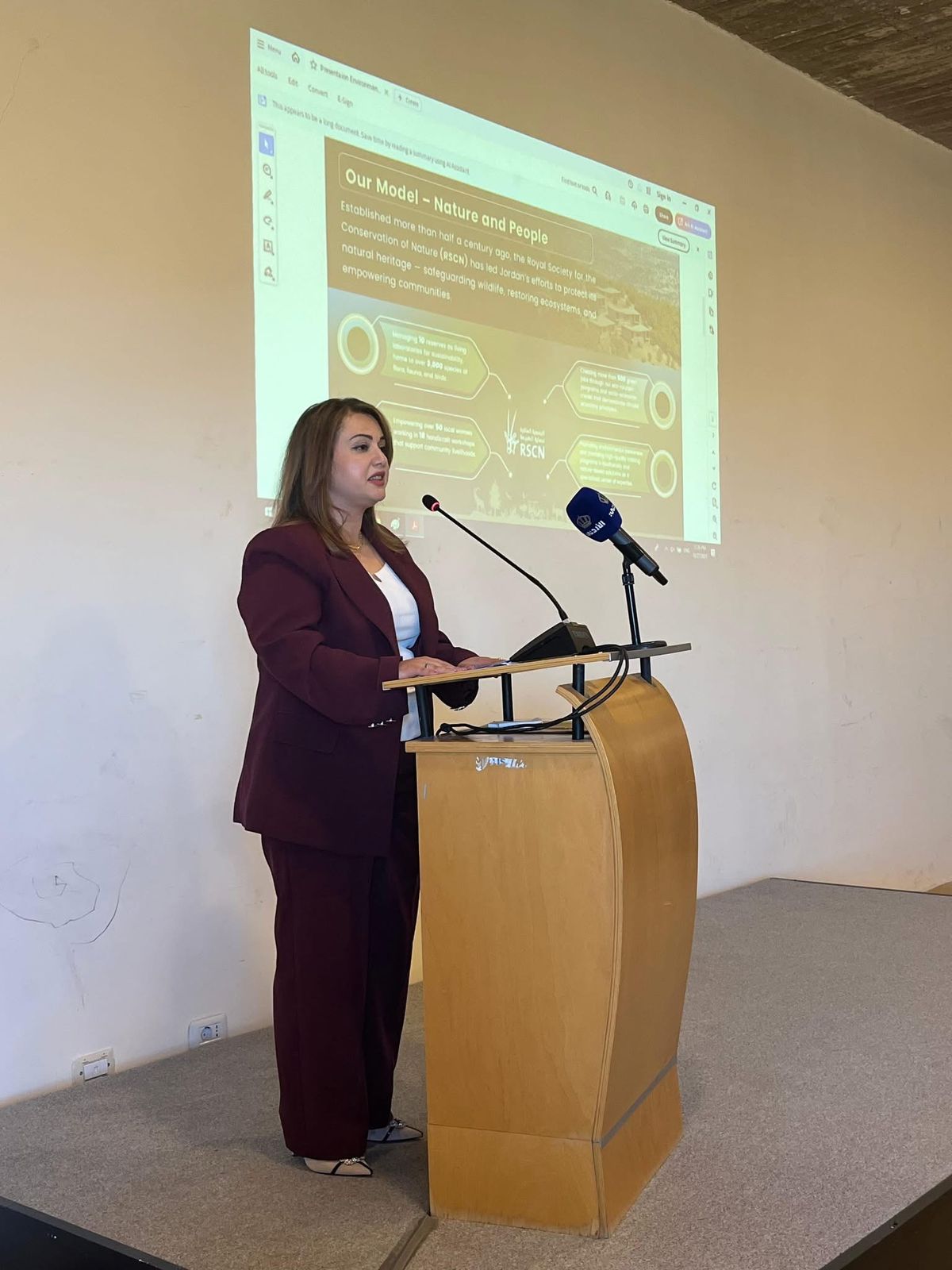 افتتحت السيدة بتول العجلوني، رئيسة مجلس إدارة الجمعية، الحفل بكلمة أكدت فيها على أهمية حماية المحميات الطبيعية ومواجهة التغير المناخي والمهددات البيئية التي تواجهها، مشددة على أن إيجاد حلول ذكية ومستدامة لهذه التحديات يمثل أولوية للجمعية. وشكرت جميع الشركاء والداعمين على مساهماتهم في تعزيز الاستدامة وحماية الطبيعة، مؤكدة على دور المجتمعات المحلية في دعم هذه الجهود.