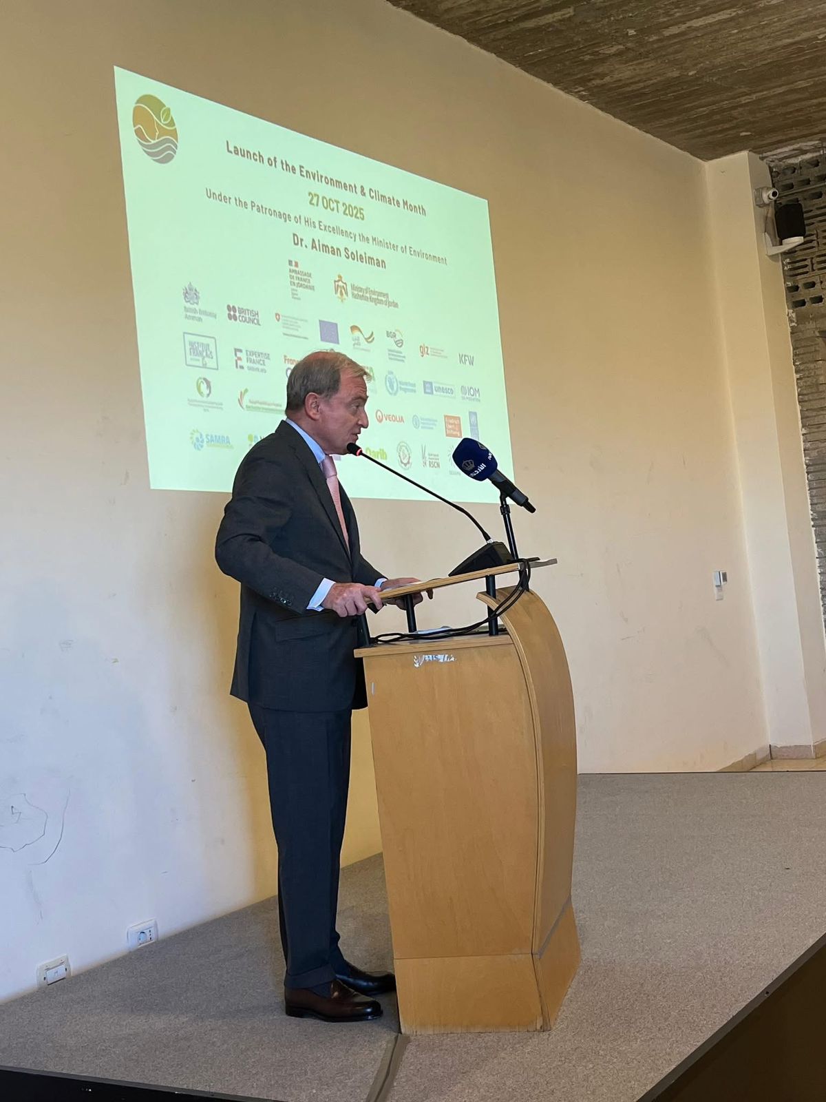 وأكد معالي الوزير الدكتور أيمن سليمان على أهمية تكثيف الجهود وتعزيز التعاون الدولي لمواجهة التغيرات المناخية، مشيراً إلى برامج التوعية التي تشجع على تبني ممارسات صديقة للبيئة في قطاعات النفايات والطاقة والمياه والنقل، وأوضح جهود الأردن في مواءمة سياساته الوطنية مع المعايير البيئية العالمية وإطلاق الاستراتيجية الوطنية للتغير المناخي 2022–2050.